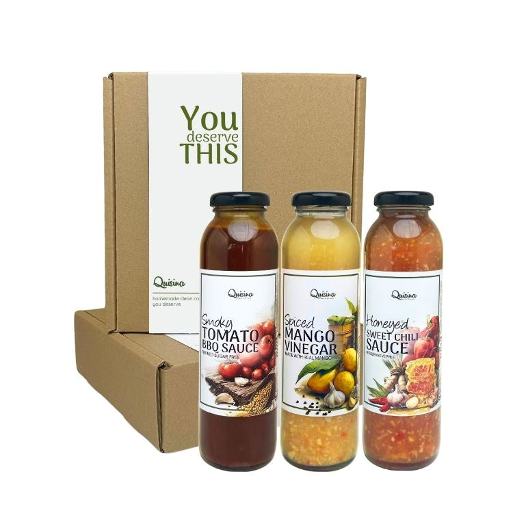 clean condiments for mindful givingboxed and ready to impresscontains:smoky tomato bbq saucehoneyed sweet chili sauce