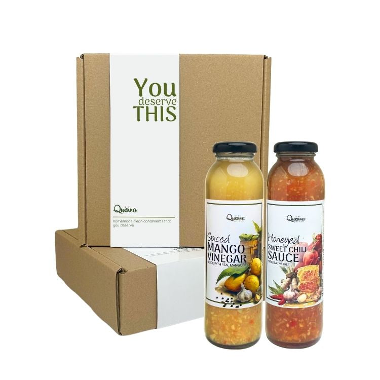 clean condiments for mindful givingboxed and ready to impresscontains:smoky tomato bbq saucespiced mango vinegar